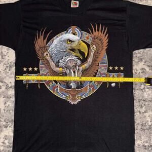 vintage 90s native american eagle t shirt, single stitch fruit of the loom heavy cotton tee, bald eagle graphic shirt, southwestern tribal art tee, biker graphic vintage shirt, 1990s made in usa blank, oversized boxy fit tee, black graphic t shirt, americana eagle print shirt, western boho aesthetic, indigenous inspired artwork tee, retro wildlife graphic, classic 90s streetwear, festival graphic tee, old school heavy cotton shirt, statement vintage t shirt, collectible 90s graphic, faded black single stitch tee