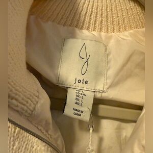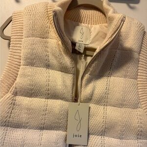 NWT This knit puffer vest by Joie features beautiful knit patterns and a funnel neck, Zips all the way up to protect from cold and wind, 2 front slit pickets, Fully lined and filled, Beautiful gold zipper pull, Ribbed knit on collar, sleeves, and bottom hem, Materials in last photo, Great neutral staple piece for your wardrobe