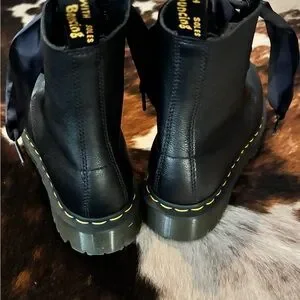 Classic Dr. Martens boots in black leather. Features satin laces for a sleek touch.