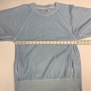 A light blue Free People Movement raglan sleeve sweatshirt. This pullover top showcases a textured cotton blend fabric with contrasting white stitching details throughout. It features a classic crew neckline, long sleeves with ribbed cuffs, and a ribbed hemline. Side seam pockets add functional style to this casual piece.