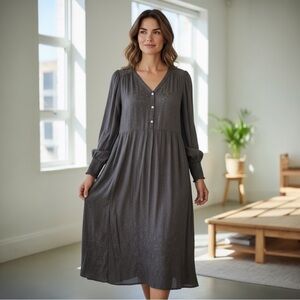 J. Jill elegant Charcoal textured Pattern Midi Dress. Features buttoned V-neck. Long sleeves with smocked cuffs. Lined. Perfect for dressy occasions.