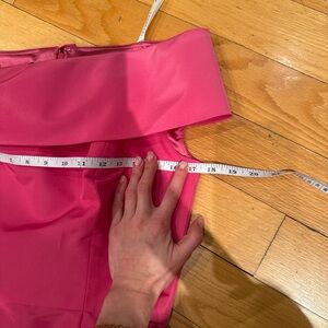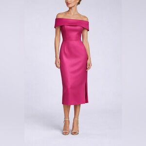 This is a structured, luxury silk cocktail dress with a fold-over off-the-shoulder neckline, tailored bodice, and elegant midi length with side slit. The color is a rich, saturated pink that photographs beautifully and makes a statement at any event.