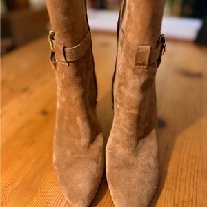 Chic tan suede boots with a sleek 4 1/5” heel. Features stylish buckle detail and point toe. Ideal for elevating any outfit. Wore once but heel is too high for me as I’m already 5’ 9”! :) Gorgeous boots!