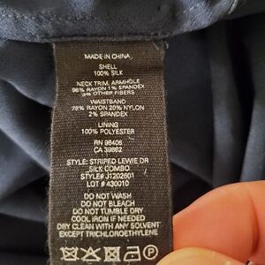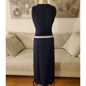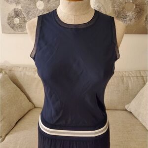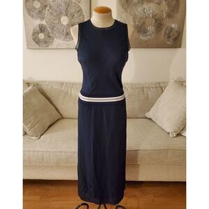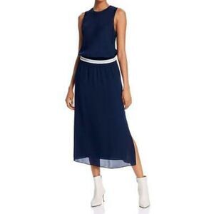 Relaxed sleeveless dress crafted in fine silk georgette finished with an athletic-inspired elasticized striped waist that creates a blouson fit. Roundneck Sleeveless Slip-on style Elasticized ribbed waist Side slit hem