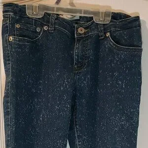 Levi’s Kids 710 Super Skinny jeans in size 16 Regular featuring a trendy all-over snow wash / bleach splatter pattern on dark blue denim. Classic 5-pocket styling with signature Levi’s fit designed for a sleek, modern silhouette.