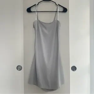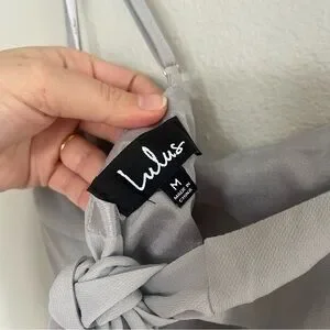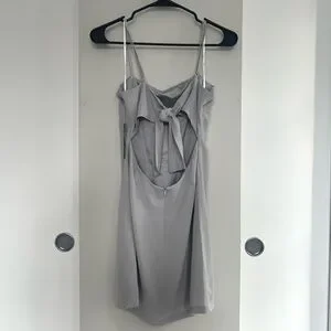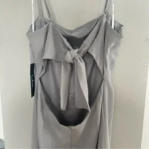 Lulus, mini dress, light gray dress, ’90s fashion, coquette style, soft girl aesthetic, romantic outfit, chic, minimalist, feminine, trendy, elegant, bow detail, open back dress, statement dress, Parisian style, balletcore, dreamy, flattering fit, summer dress, night out, wedding guest, versatile, soft aesthetic, city chic, neutral tones, adjustable straps, zipper closure, timeless, fashion-forward, must-have