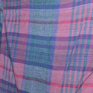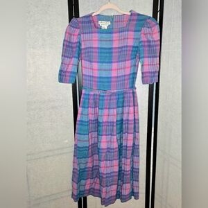 Vintage Herman Geist Pink Purple Blue Plaid Midi Linen Cottage Dress. Size Small. Back Zipper Closure, has pockets