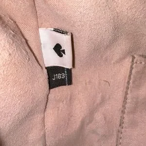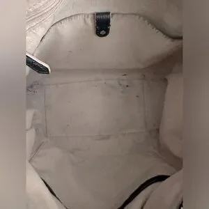 Pale pink edging on the strap and pale pink leather lining. The lining is pretty marked with pen/makeup.