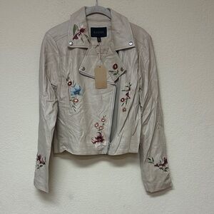 Chic leather jacket with floral embroidery. Stylish and versatile. Perfect for layering.