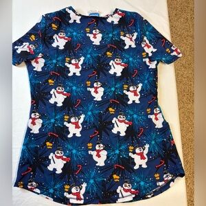 Blue scrub top featuring Frosty the Snowman print with red and yellow accents. Has front pockets.