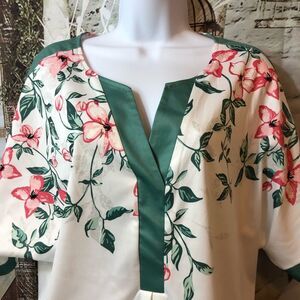 Floral Tunic Top Green White V-Neck Short Sleeve Blouse Boho Cottagecore XL