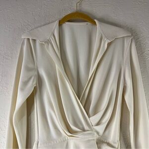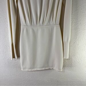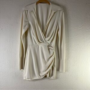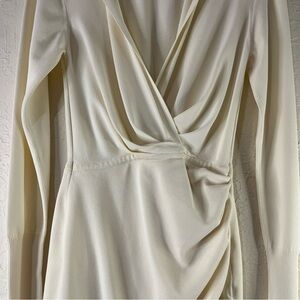 Elegant cream mini dress by Gauge81. Features a deep V-neck and long sleeves. Perfect for chic occasions.