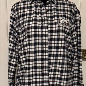Stylish plaid button down. Features unique graphic on back. Comfortable and trendy.