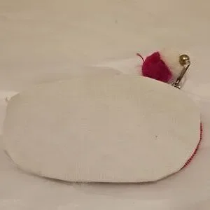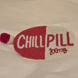 Fun clutch shaped like a chill pill. Features pink and white beaded design with a playful pom-pom.
