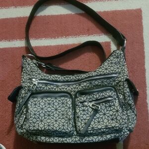 Stylish women's bag featuring a geometric pattern in black and white. Perfect for everyday use with multiple zippered pockets for convenience.