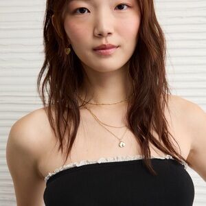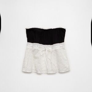 Brand new with tags American Eagle strapless babydoll top in a chic black and white contrast design. Features a soft black ribbed bodice with delicate ruffle trim along the neckline and a flowy white eyelet lace peplum bottom with adjustable tie detail at the waist.