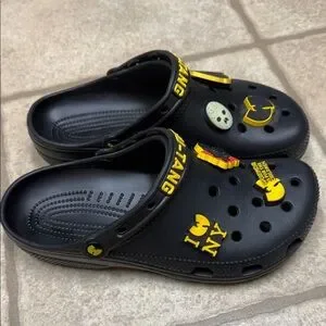Bold black mules featuring striking yellow accents. Adorned with unique graphic charms. Ideal for everyday comfort.