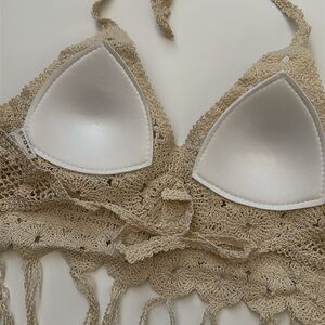 Elevate your style with this chic floral crochet halter, deep v-neck, adjustable tie back, fringe trim, cropped length top. Has non-removable padded cups.