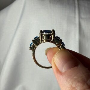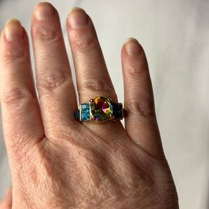 A beautiful ring done in gold plating featuring a center oval rainbow crystal and side blue square crystals. The ring is a size 8.