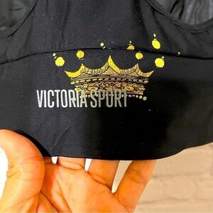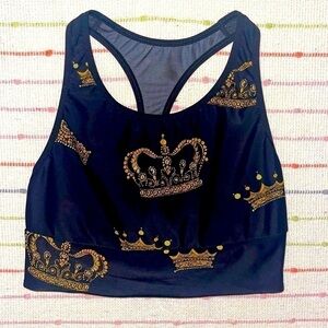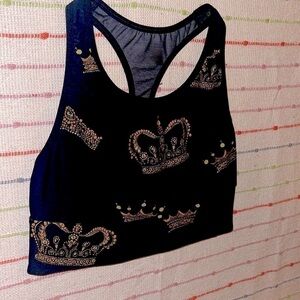Victoria’s Secret-The Player by VS Racerback Sport Bra. Light weight, no extra padding, sweat-wicking fabric with four-way stretch. Wireless, scoop neckline. Color: black and gold crown prints all over. Racerback : mesh fabric. Good condition, however size tags were removed. Size is S. Pet and smoke free home