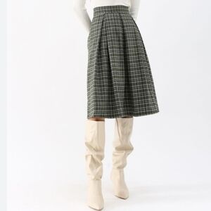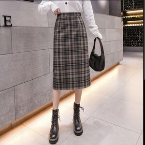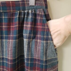 This gorgeous Vintage wool midi skirt from Lady Halrin features a beautiful grey, burgundy red, tan, and blue tartan plaid that is perfect for the season. It has a midi slighty a-line silhouette with side pockets and a full lining. Back talon zip closure. Models show similar styles. 100% pure wool