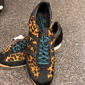 ADIDAS Leopard Print Sneakers with Black Stripes & dark green laces. NWT.