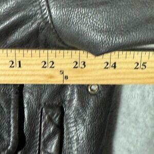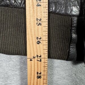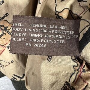 Pre-owned leather flight jacket with moderate overall wear from prior use and storage. Leather shell shows creasing, scattered surface scuffs, and a small white mark on the left sleeve, and there is tarnish and green corrosion on some collar snap hardware. Rib-knit cuffs and hem have discoloration, lint, and general wear, while the interior map-print lining shows wrinkles and scattered small marks; zipper and snaps are functional, and the jacket is sold without original tags or packaging.