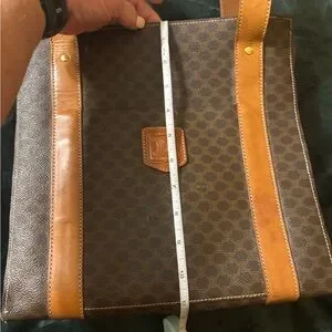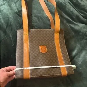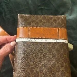 Vintage Celine bag with classic macadam brown pattern. Features tan wide straps with a 13” drop! Holds its structure when sitting, has zipper at opening, and a front slot for easy phone access! Great everyday bag! Dimensions in photos.