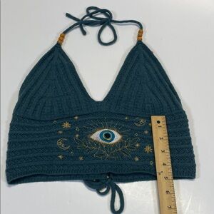 Brand new with tags ROMWE crochet knit halter top in deep teal with embroidered evil eye detail.