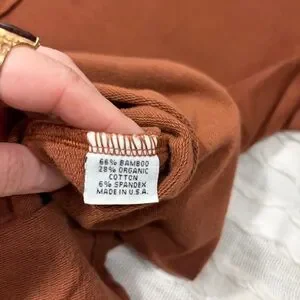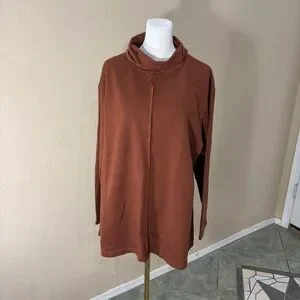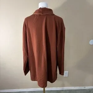 The Bryn Walker Tunic Brown Sweater Top in XL size is a comfortable and stylish addition to any woman's wardrobe. Made from a blend of bamboo and organic cotton, this oversized sweater features a high neck, long sleeves, and a cowl neck accent for added flair. Perfect for travel, casual outings, or workwear, this relaxed fit tunic is machine washable and ideal for the winter, fall, and spring seasons. Designed in the United States and embracing the Lagenlook style, this sweater exudes a sense of comfort and sophistication.