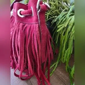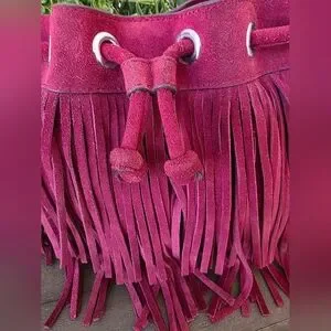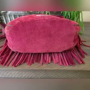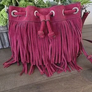 Add a boho-chic vibe to your look with this authentic Rebecca Minkoff fringe bag. Crafted from soft burgundy suede, this stylish crossbody features dramatic fringe detailing, a secure top closure, and an adjustable strap for versatile wear. Perfect for festivals, casual outings, or adding texture to your everyday style.