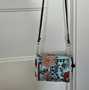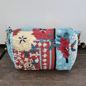 Beautiful Intricate Beading with a Floral Pattern. Bright Colors for All Seasons and Occasions including Blue, Yellow, Pink, Red, Green, White and Black. Zip Closure with a Knit Black Pom and Long Black Strap with Gold Colored Hardware. 6" L x 3.5" W x 5" H.