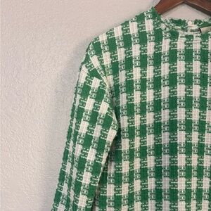 Chic green plaid dress with long sleeves. Perfect for versatile styling. Features: relaxed fit, shift silhouette, 3/4 sleeves, side pockets hits on knee, back zipper. Unlined.