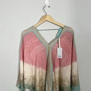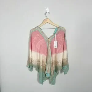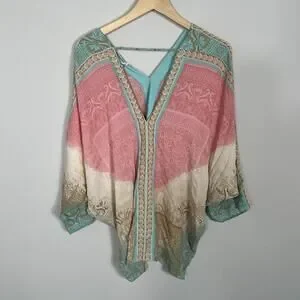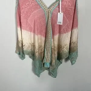 Elegant V-neck top with intricate patterns. Features a blend of pink and teal hues. Lightweight and flowy design.