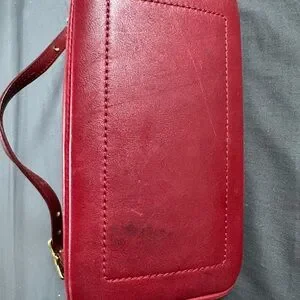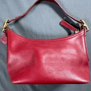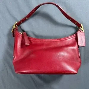 Selling this vintage Coach mini baguette bag in a nice deep red leather. It's got that classic 90s/early 2000s look and is the perfect size for just the essentials when you're heading out. The leather feels solid and it has the brass hardware. Overall it's in good shape, just a cool little piece to throw over your shoulder.
