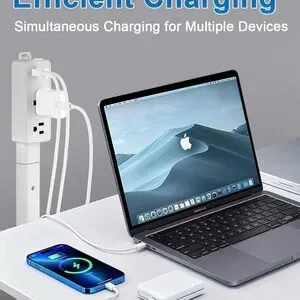 Efficiently charge your devices with this white multi-outlet power strip featuring USB ports. Perfect for home or office use.
