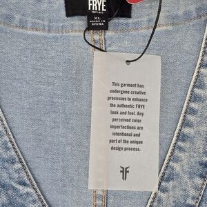 New with tags women's size XL Feye denim mini dress in light wash. Western essence meets effortless style with this Frye minidress. Made from premium stretch denim that's soft yet durable, offering a worn-in comfort that feels like an old favorite from the very first wear. Featuring a flattering V-neckline and signature metal buttons that run all the way down the front, this sleeveless silhouette is easy, timeless, and endlessly wearable. Pair it with Frye’s iconic leather boots, rugged sandals, or sneakers for a casual yet refined look. New with tags - never worn. Ships fast from a smoke-free home.