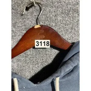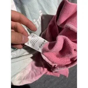 Pre-owned Sergio Tacchini hooded pullover with moderate overall wash wear and wrinkling from normal use and storage. Fabric, hood, sleeves, cuffs, and logo graphic are clean, intact, and legible. Small hole and fabric separation are present at the front hem as shown in photos.