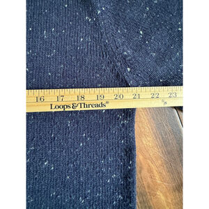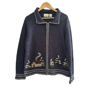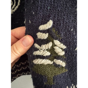 • Navy speckled knit with winter cabin + tree scene