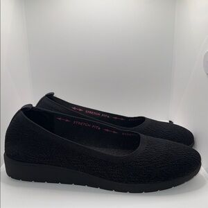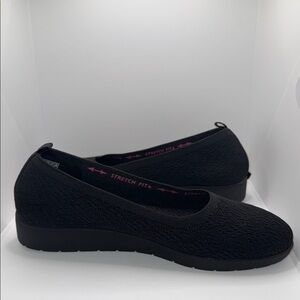 Skechers Cleo Flex Wedge Flipside Skimmer Slip On Knit Shoes Women’s 10 Black. Stretch fit, slip on, knit upper, round toe, air cooled memory foam footbed, wedge, rubber sole. Great condition!
