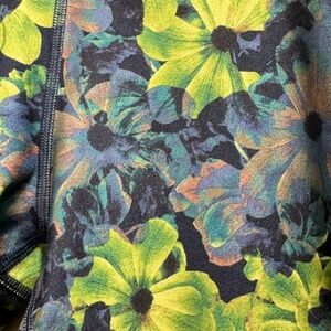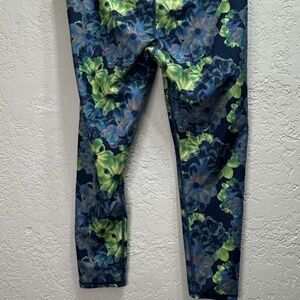 Excellent used condition Fabletics workout leggings in a bold blue and green floral print. These cropped leggings feature a wide high-rise waistband for a flattering, supportive fit. Soft, stretchy performance fabric with 86% polyester and 14% elastane for comfort and flexibility. Perfect for gym workouts, yoga, running, or athleisure wear.