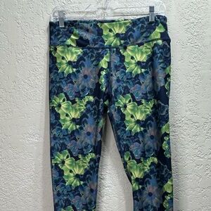 Fabletics leggings, Fabletics workout pants, floral leggings, blue green leggings, high rise leggings, cropped leggings, athletic wear, activewear, gym leggings, yoga pants, running tights, athleisure, performance leggings, stretchy leggings, women’s workout clothes, size large leggings, compression leggings, moisture wicking leggings