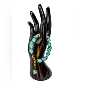 This beautiful turquoise stones bracelet features a striking mix of natural turquoise beads in varying shapes and sizes, displayed elegantly on a black mannequin hand display.
