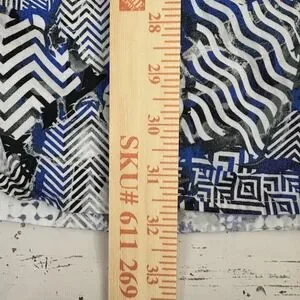 Details: Multicolor geometric patchwork print with mixed chevrons, dots and maze motifs in blue, black and white