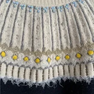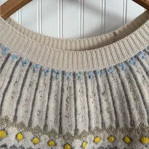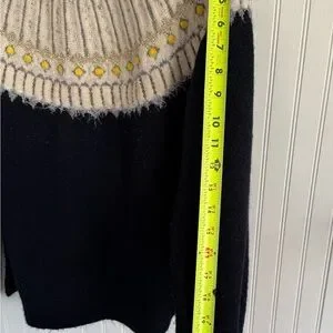 Festive sweater size L with a navy base and cream yoke. Features yellow accents for a pop of color. Perfect for cozy style. Has some pilling from prior wear- please see photo.