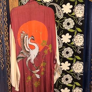 Free People Rising Sun Maxi Kimono, a silky, statement robe designed with a bold crane and sun graphic on the back.