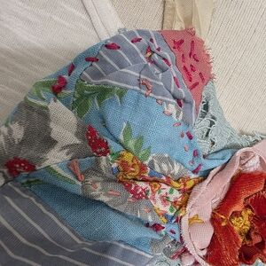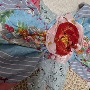 FEED SACK JABOT featuring floral feedsack textiles, crochet stitching patterns and lots of slow stitching. Perfect for adding a touch of elegance.