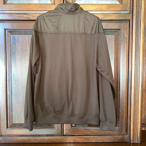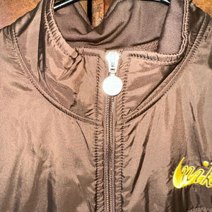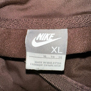 Pre-owned Nike men's size XL full-zip jacket. Brown with gold embroidered logo and stars. Features a stand-up collar, two front pockets, and a full-length zipper. The body is 100% polyester; overlay is 100% nylon. Made in Malaysia. Shows minor signs of wear, consistent with pre-owned condition. Measurements are not provided. No model number visible.