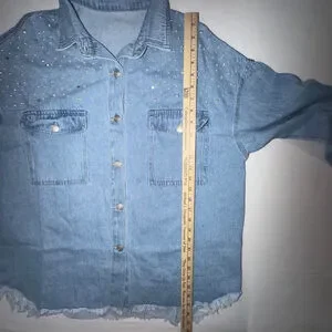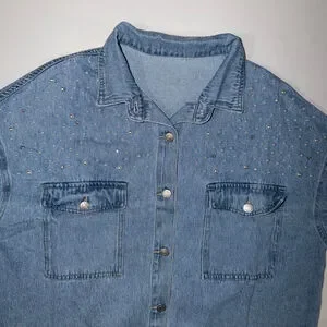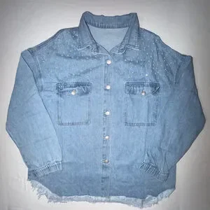NWOT Pearl Rhinestone Denim Shirt Jacket XL Light Wash Raw Hem Western Shacket