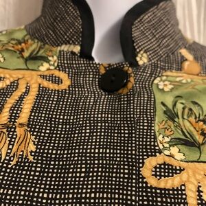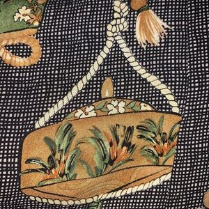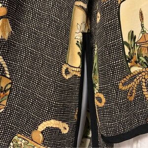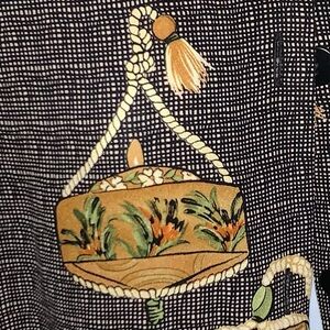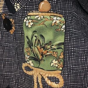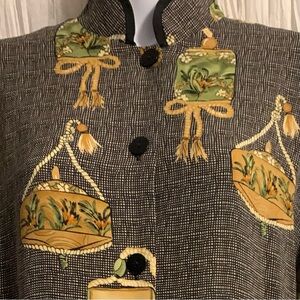 HARARI Stunning Harari button-front jacket in a luxurious 100% silk. This "Art to Wear" piece features a unique, intricate print of Asian lanterns with floral inserts and hanging tassels